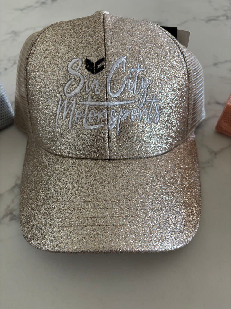 This cap features a rounded bill, a glitter front, a mesh back with a glitter Velcro adjustable back strap, and top opening for your high ponytail or messy bun.